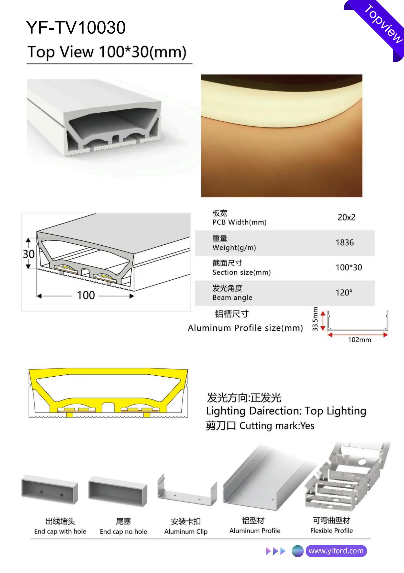 The TV10030 features a cross-sectional size of 100mm x 30mm, with an exceptionally large light-emitting surface. This allows for the accommodation of two 20mm wide, ultra-bright LED strips, ensuring substantial light output while maintaining a slim profile, making it a highly recommended choice for applications requiring both decorative and large-scale illumination.