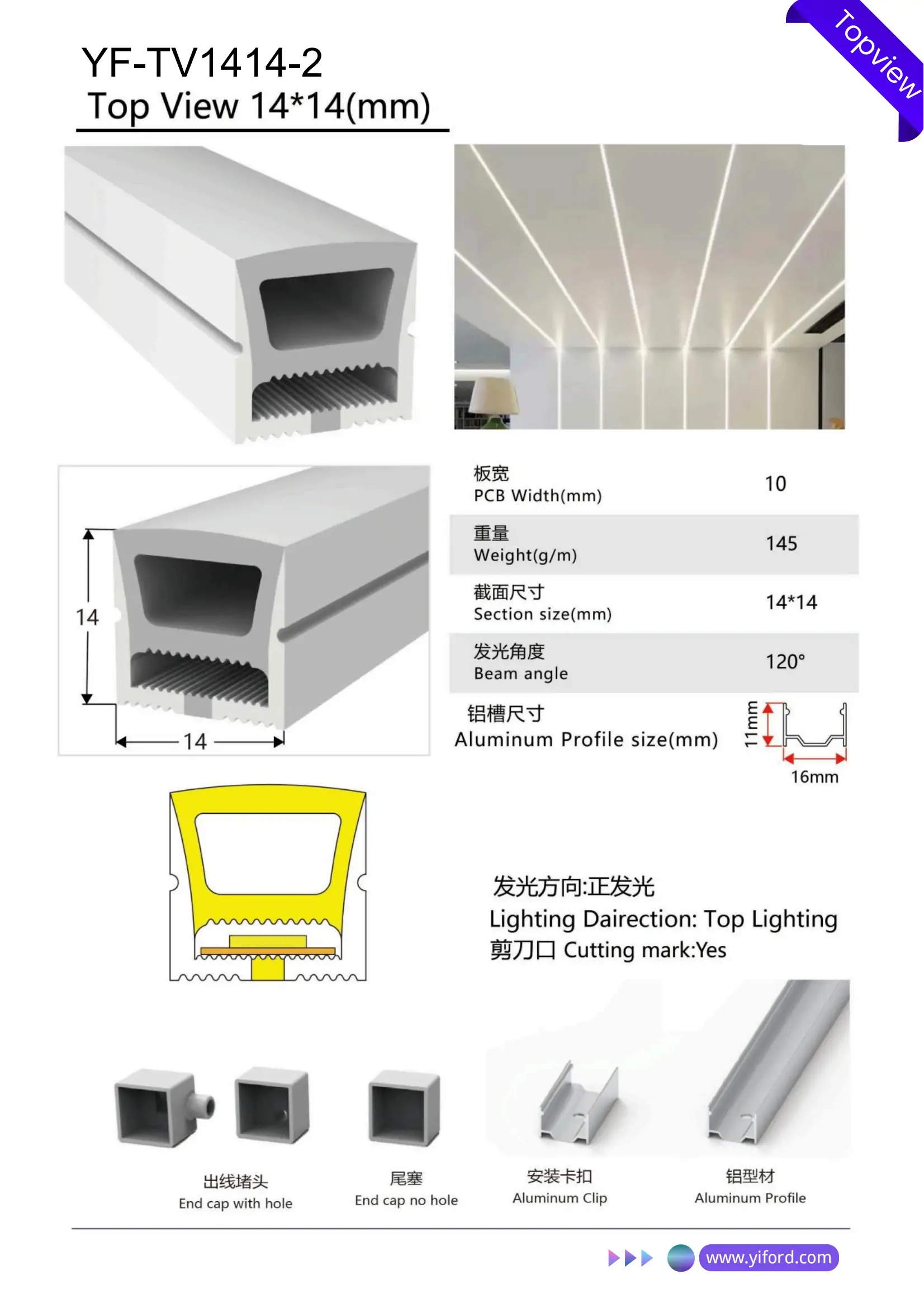 The TV1414-2 features a cross-sectional size of 14mm x 14mm, which is both small and practical. This size allows for easy integration into various lighting setups without taking up much space. It is recommended to be paired with a 10mm-wide LED strip, ensuring a seamless and efficient lighting combination.