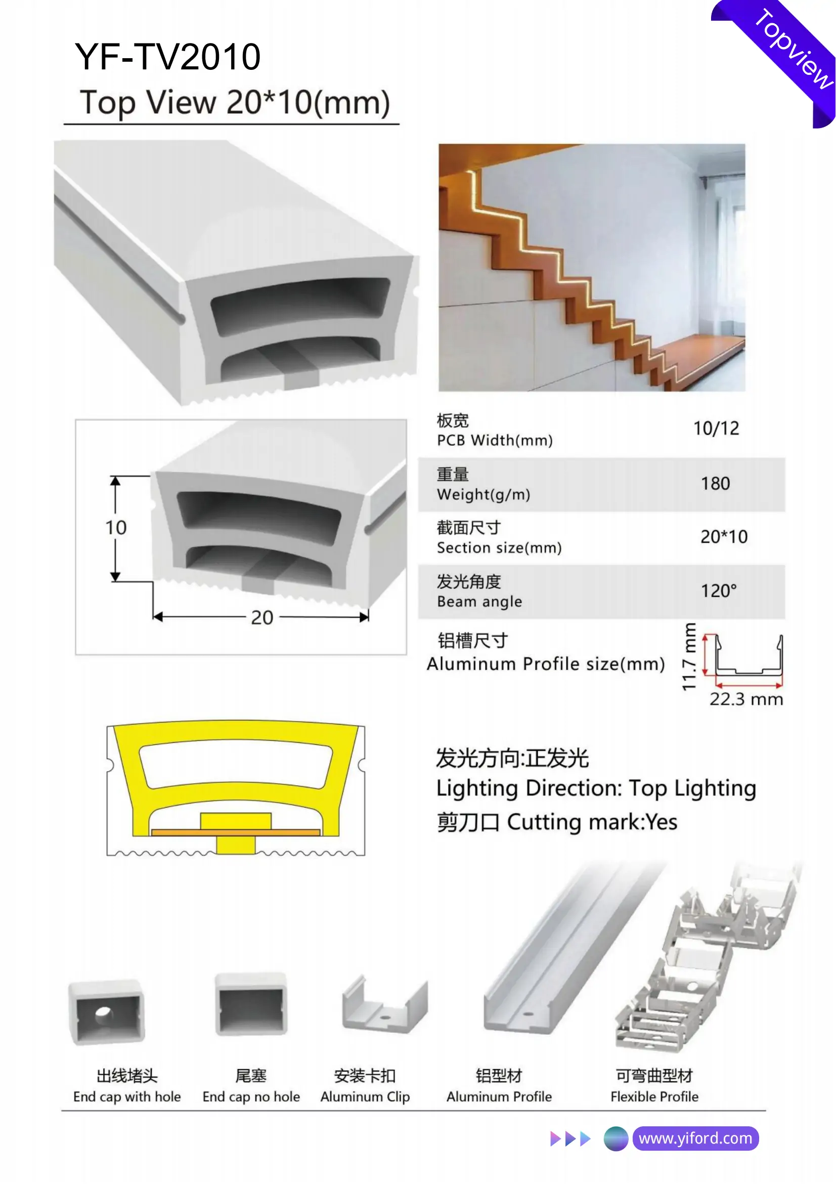 The TV2014-1’s design simplifies the installation process, making it a cost-effective solution for professional users. The combination of the silicone tube, LED strip, and end caps results in YIFORD’s SILICONE LED STRIP LIGHTS, a finished product that can be directly implemented in various projects.