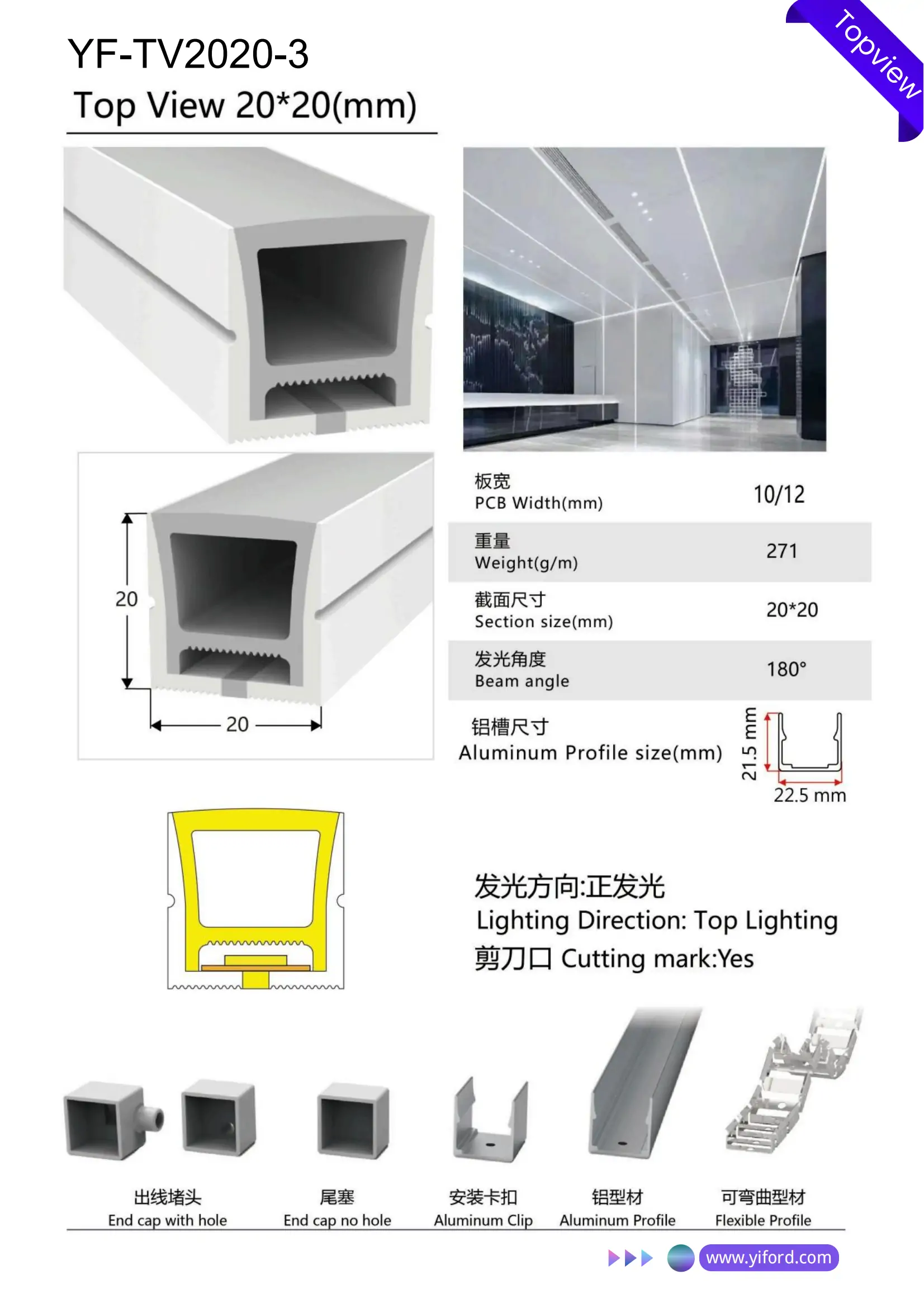 YIFORD is a leading LED lighting supplier, specializing in providing materials and finished products to manufacturers, distributors, design firms, builders, and engineering contractors. With over 300 different models of silicone tubes and over 300 different models of COB/SMD LED strips, YIFORD offers thousands of combinations for silicone LED strip lights. The TV2020-3’s large light-emitting surface, flexible square profile, and wide illumination make it an excellent choice for professionals seeking reliable and high-performance lighting solutions.