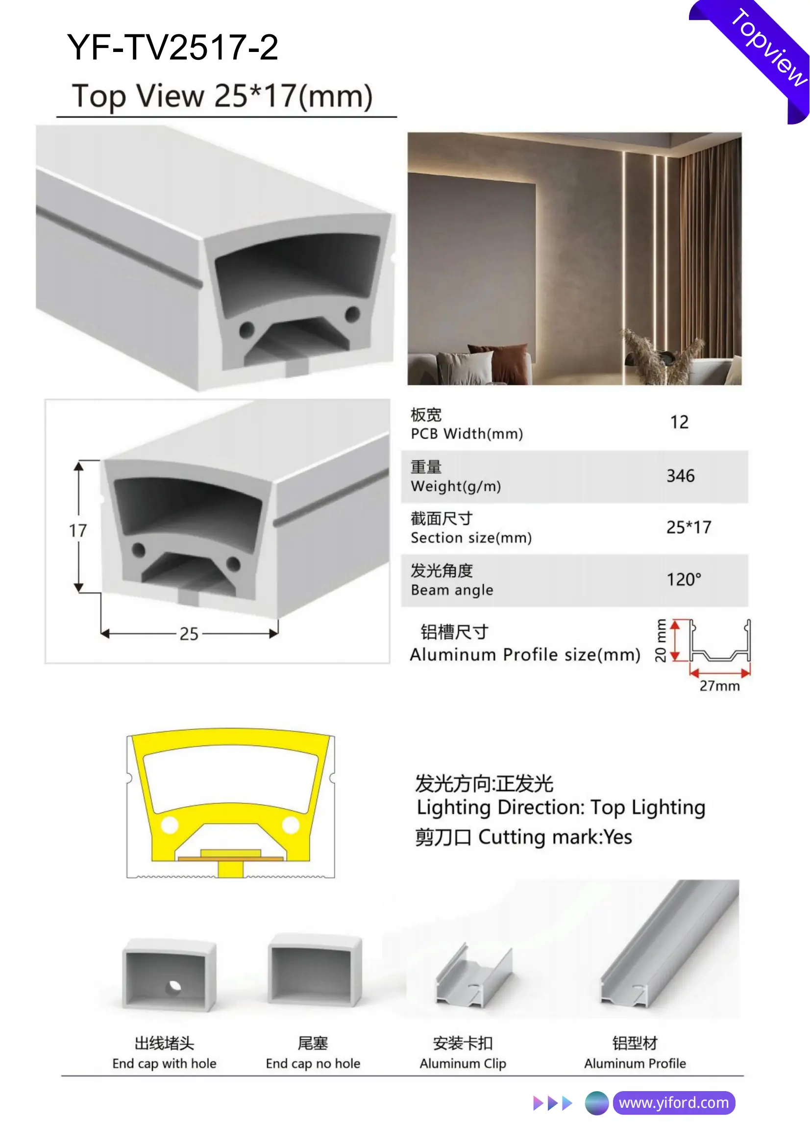 The TV2517-2 features a cross-sectional size of 25mm x 17mm, with a large light-emitting surface. This allows for the accommodation of 12mm wide LED strips, ensuring a substantial light output while maintaining a slim profile, making it a highly recommended choice for applications requiring effective lighting.