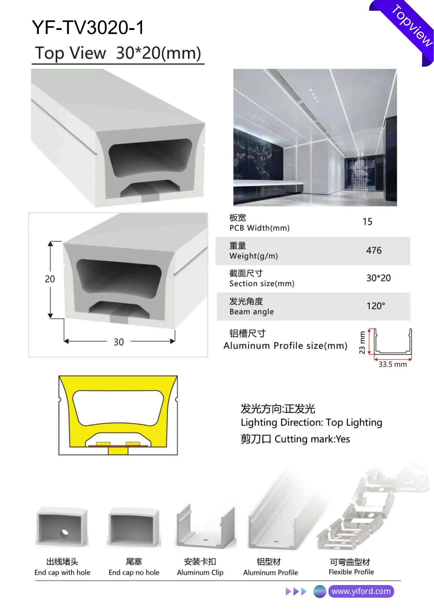 The TV3020-1 features a cross-sectional size of 30mm x 20mm, with a large light-emitting surface. This allows for the accommodation of 15mm wide, ultra-bright LED strips, ensuring substantial light output while maintaining a slim profile, making it a highly recommended choice for applications requiring both decorative and large-scale illumination.