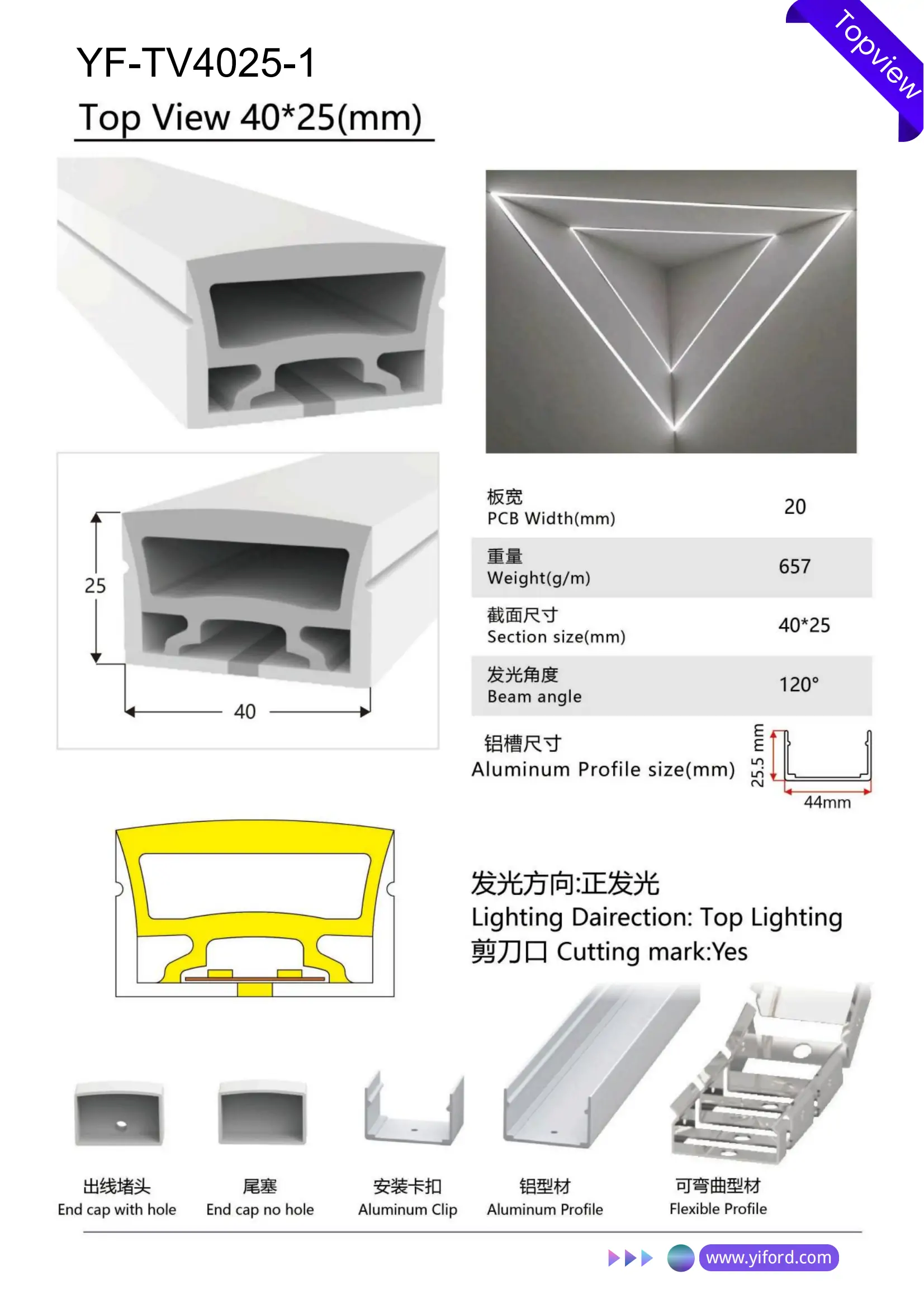 The TV4025-1’s design simplifies the installation process, making it a cost-effective solution for professional users. The combination of the large sleeve led silicone diffuser, LED strip, and end caps results in YIFORD’s SILICONE LED STRIP LIGHTS, a finished product that can be directly implemented in various projects.